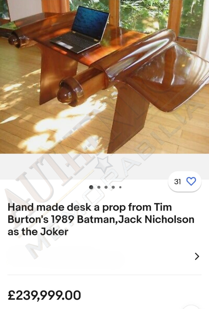 Displayed for comparative reference are two original props from the same production: the 6-foot Batwing, sold for $409,500, and the Joker’s desk, last seen on the market two years ago at £239,999.